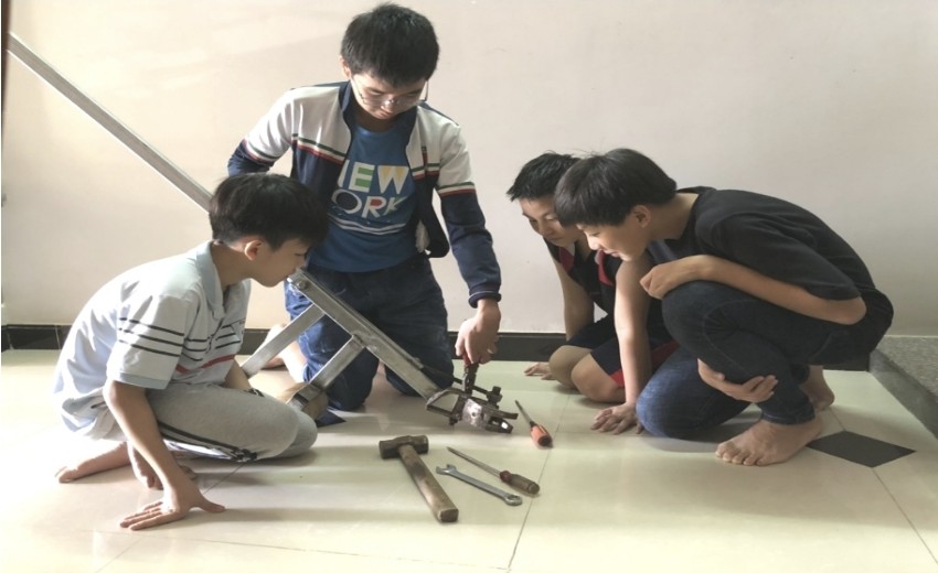 Trần Minh Tiến, chia sẻ: “Thấy các cô, chú khi thu hoạch sắn mì phải khom lưng nhổ rất vất vả và tốn sức lực nhiều. Đặc biệt là được học và được xem các chương trình khoa học về việc con người sử dụng đòn bẩy. Chúng em bàn bạc làm sao để có được một dụng cụ nhổ sắn bằng dụng cụ đơn giản, dễ kiếm, dễ tìm, giảm sức lực lao động nhưng tăng năng suất thu hoạch”; “ Chúng em bắt tay vẽ bản thảo kỹ thuật, tính toán về kích thước của cánh tay đòn rồi nhờ thầy, cô góp ý thêm. Sau đó chúng em tìm kiếm vật liệu và thiết bị phù hợp với các dữ liệu để làm ra sản phẩm như mong muốn”. Học sinh Tiến và Phát cho biết thêm.