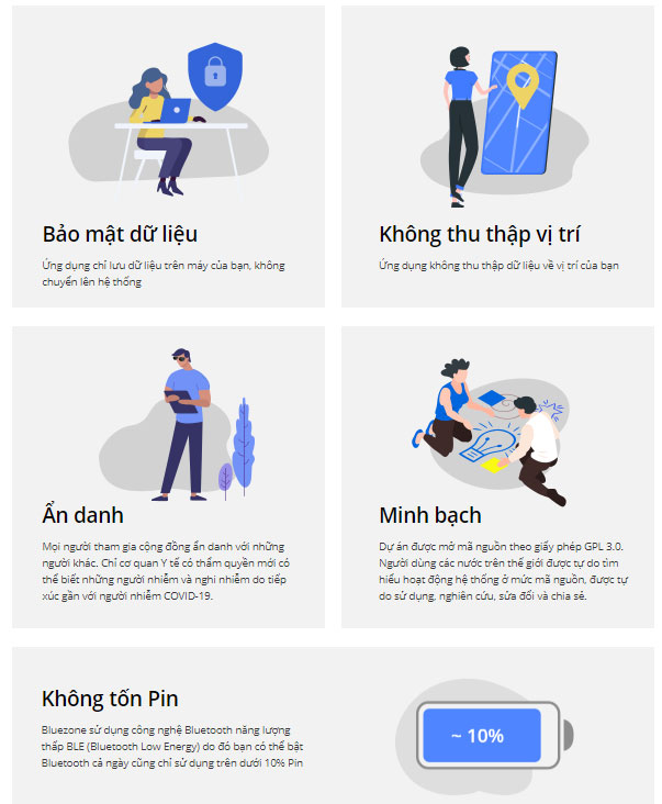 Để người dùng có thể yên tâm sử dụng, Bluezone cam kết ứng dụng này sẽ: